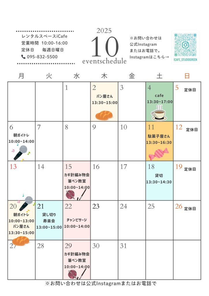 🗓 10月レンタルスペースicafeイベントのお知らせ2025年10月13日活動ブログ 🗓 10月のイベントスケジュール公開! ☕️ 定期イベントのご案内定期イベント開催中!予約制のイベントもございますので詳細はInstagramをご確認ください。→https://www.instagram.com/p/DNzZ7eMXskO/?igsh=MTY3M3c4NXR6ZnN4cQ== 🏡 レンタルスペース受付中「ワークショップを始めたい」「イベントをしたい」「お茶会や会議場所として使いたい」など、レンタルスペースへの申し込みは受付中です。お気軽にお問い合わせください。 📍 レンタルスペース icafe営業時間:10:00~16:00定休日:日曜日 皆さまのご来店を心よりお待ちしております💐 投稿ナビゲーション << 前の記事